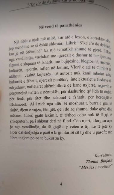 Sa shpejt na ike. Shtrydhe e lotove zemra. Qoftë dheu i lehtë mbi trupin tuaj, mësuesi ynë, mësues Thomai! Mbetesh intelektual i shquar, njeri i mirë, prind shembullor. Një biografi e Thoma Binjakut ndodhet në librin ,”Çdo kodër me histori”. ( Edhe unë të dua Mallakastër).
