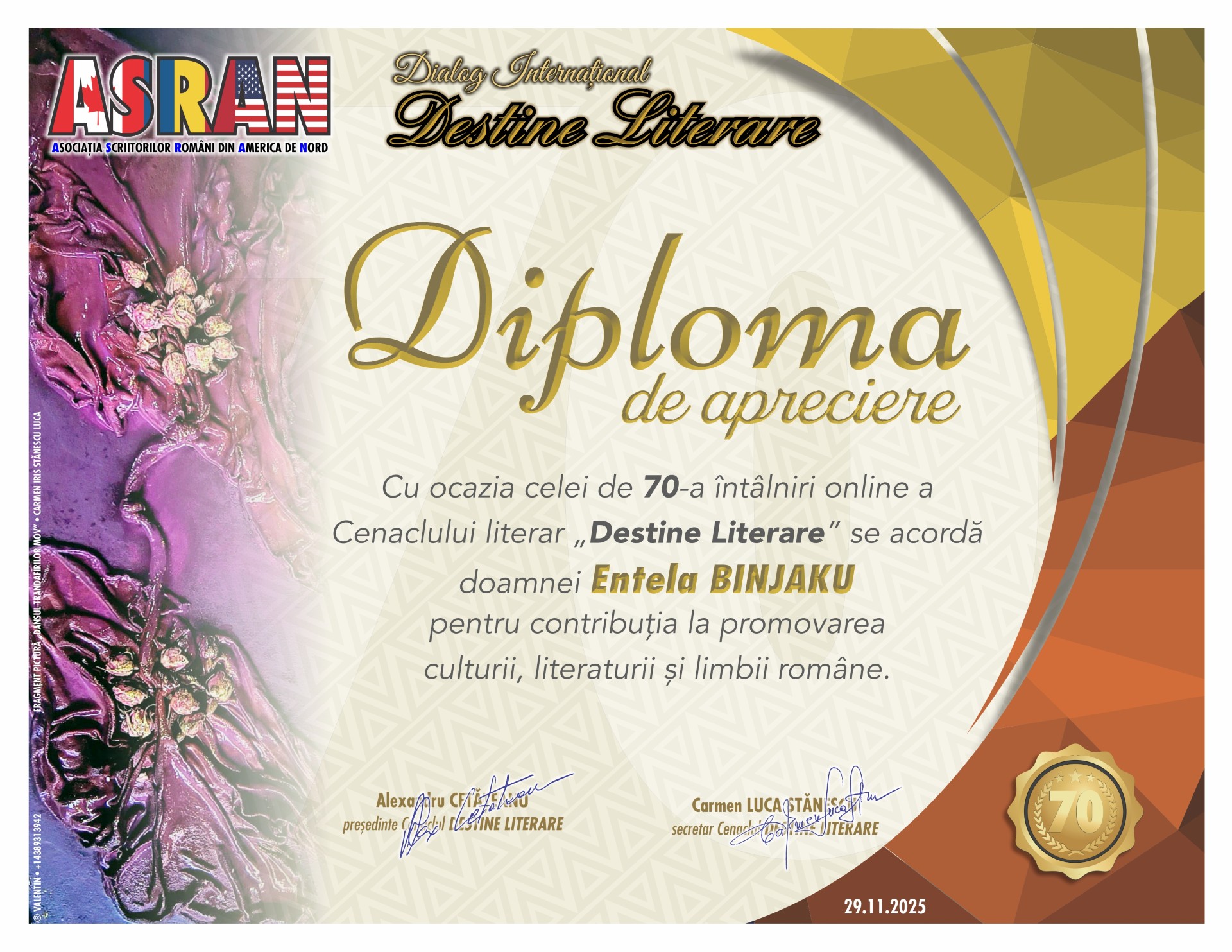 Doamna Entela Binjaku, director executiv al Asociatiei ” Fondacioni Harriet Martineau” a primit a Diplomă de apreciere pentru participarea la Cenaclul “Destine literare”, întâlnirea 70 și pentru contribuția promovarea culturii, literaturii și limbii române”. Diploma i-a fost acordata din partea Colectivului de Organizare al Cenaclului DESTINE LITERARE” căruia dorim să-ii multumim si pe această cale.