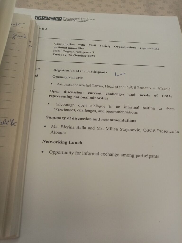 Organizata për Siguri dhe Bashkëpunim në Evropë (OSBE) – Prezenca në Shqipëri organizoi te marten e dates 28 tetor 2025 një konsultim me organizatat e shoqërisë civile që përfaqësojnë pakicat kombëtare ose janë të specializuara në çështjet e pakicave kombëtare. I pranishem ne takim ishte Drejtuesi i Prezences se OSBE-se ne Shqiperi, ambasadori Michel Tarran.