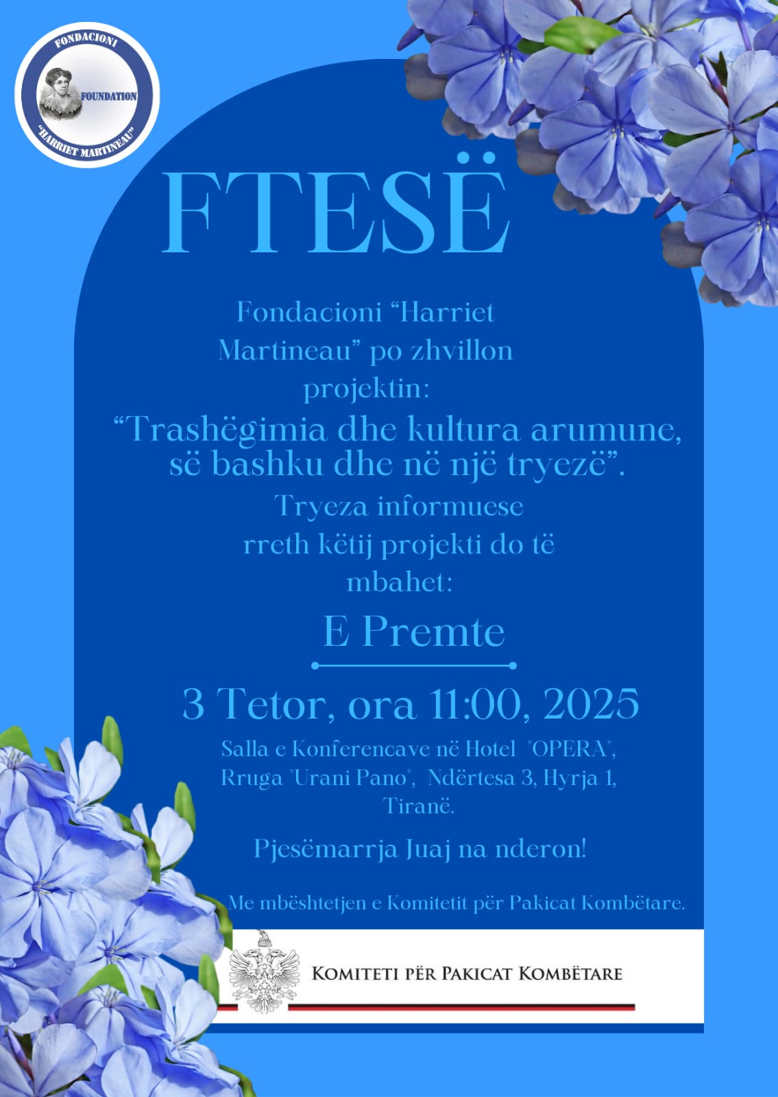 Fondacioni “Harriet Martineau” po zhvillon projektin: “Trashëgimia dhe kultura arumune, së bashku dhe në një tryezë”. Tryeza informuese rreth këtij projekti do të mbahet më 3 tetor 20225, ora 11.00 në sallën e Konferencave të Hotelit “OPERA”, Rruga “Urani Pano”, Ndërtesa 3, Hyrja 1, Tiranë. Projekti po zhvillohet me mbështetjen e Komitetit për Pakicat Kombëtare. Kjo tryezë do të organizohet pas veprimtarisë së tretë, demonstrimit 2 ditor të gatimeve tradicionale të përgatitura nga gratë e pakicave kombëtare të Elbasanit. “Ekspozita e shijes” do të mbahet në qytetin e Elbasanit më 27 shtator 2025 në mjediset e bar “Meduzës” dhe më 28 shtator 2025 në Famullinë Ortodokse “Shën Nikolla” prej orës 11.00. Në një stendë do të prezantohen gatimet autentike që do të jenë pjesë e botimit të një broshure mbi Trashëgiminë Kulinare duke nisur që nga përgatitja e ushqimit tradicional, historiku i tyre, deri tek recetat përkatëse.